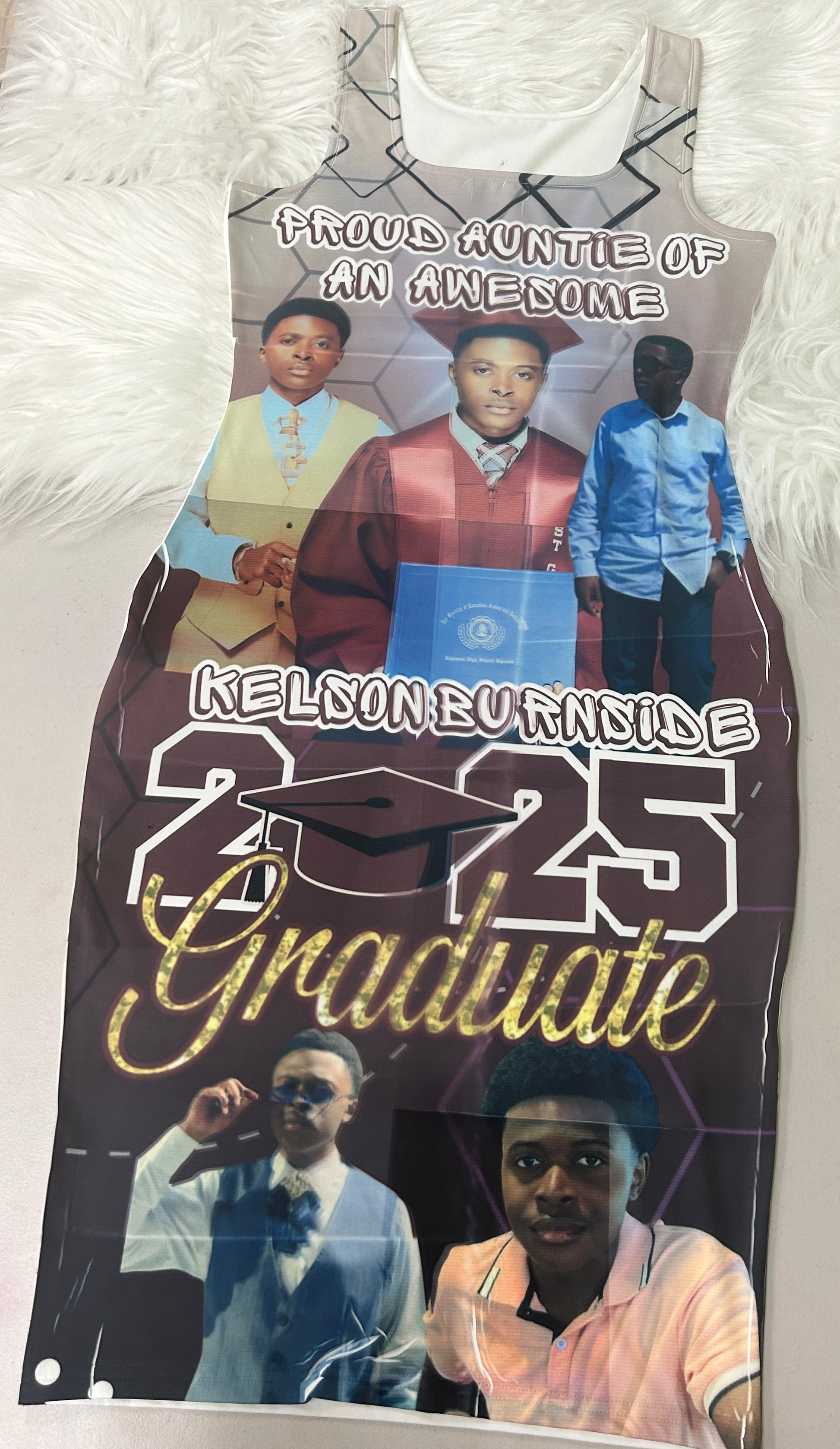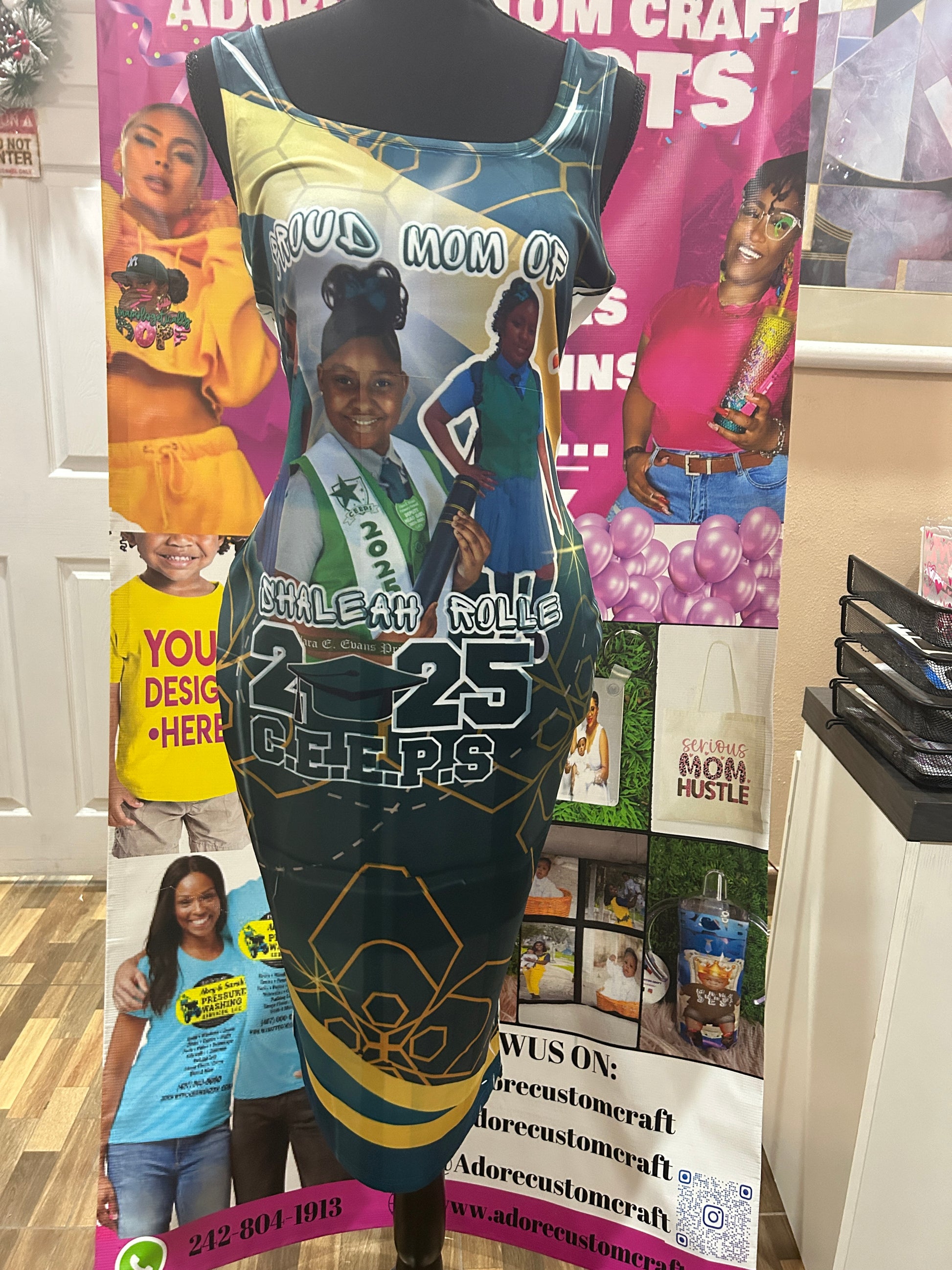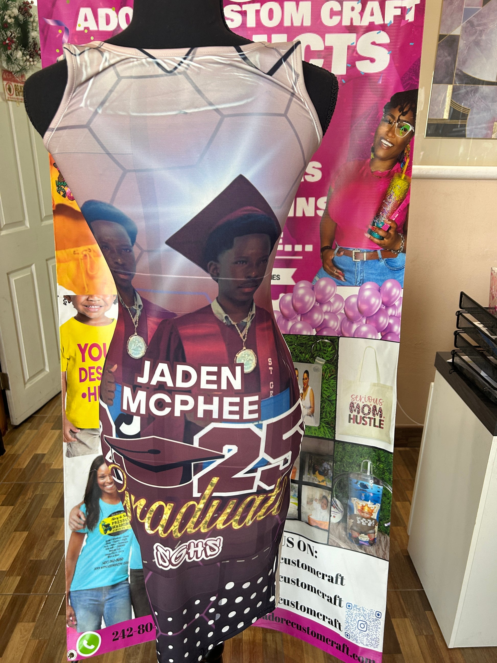 Add photo and short phrase on the dress. Dress texture is polyester ans spandex.